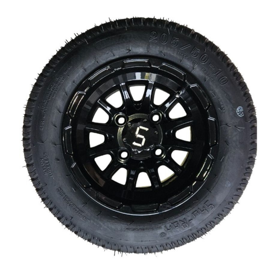 Upgrade your golf cart with this 205/50-10 Gloss Black Tire and Wheel Combo. Combines a sleek gloss black wheel with a durable tire for enhanced performance and style.