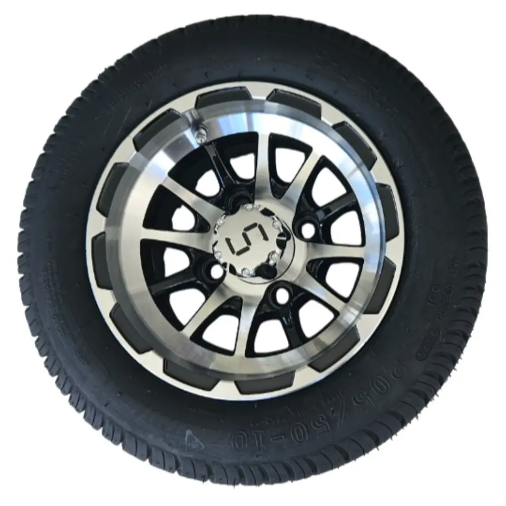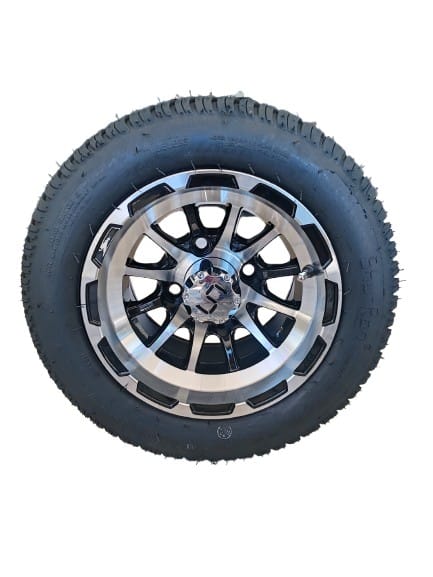 Upgrade your golf cart with this 205/50-10 Machined Gloss Black Tyre & Wheel Combo. Built for durability and smooth performance, it provides excellent traction while giving your cart a sleek, modern appearance.