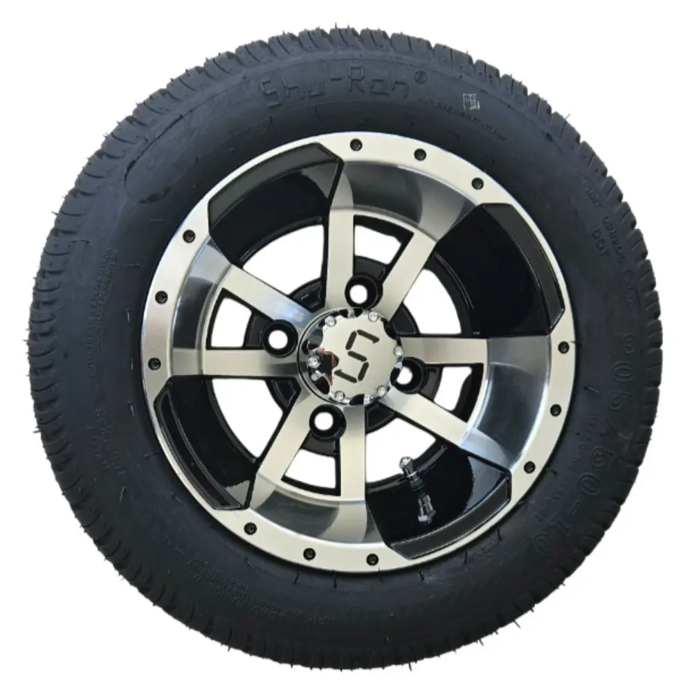 Enhance your golf cart with this 205/50-10 Machined/Gloss Black Tyre & Wheel Combo. Combining style and performance, it delivers excellent traction, a smooth ride, and a durable finish with a sleek machined/gloss look.