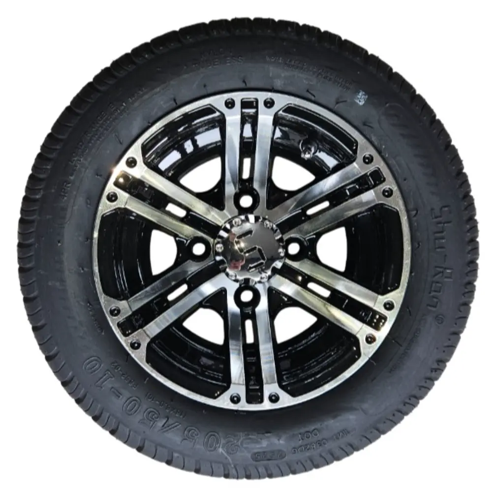 Enhance your golf cart’s style and performance with this 205/50-10 Machined/Gloss Black Tire and Wheel Combo. Offers a sleek look and reliable traction for all terrains.