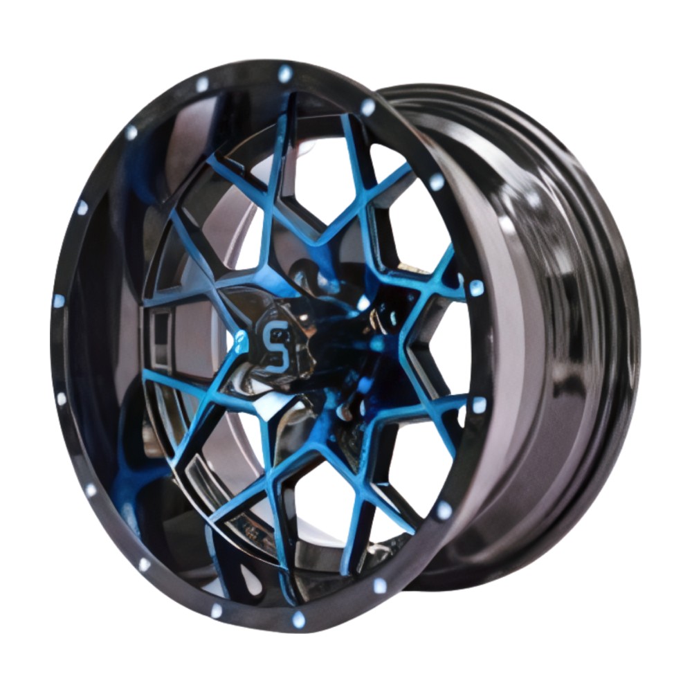 Upgrade your golf cart with this 12″ Blue/Gloss Black Wheel. Features a stylish two-tone finish for a modern, eye-catching appearance.