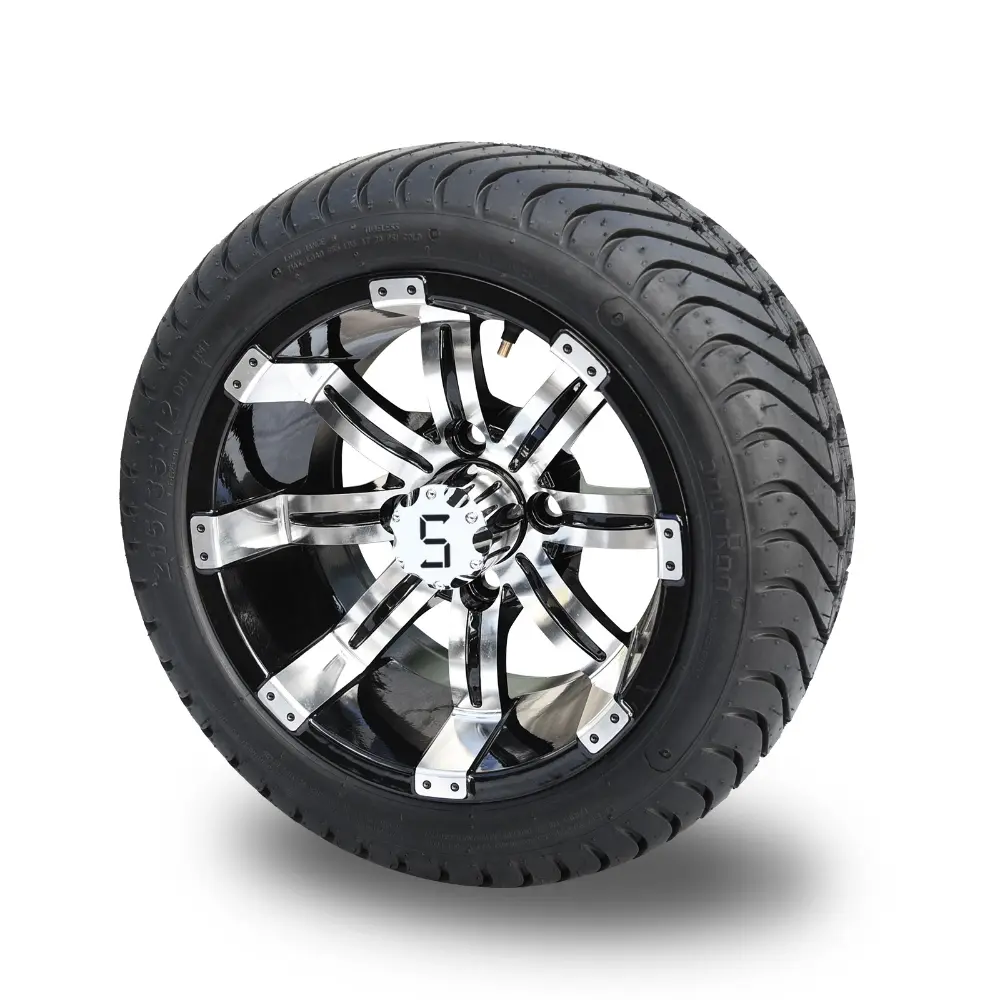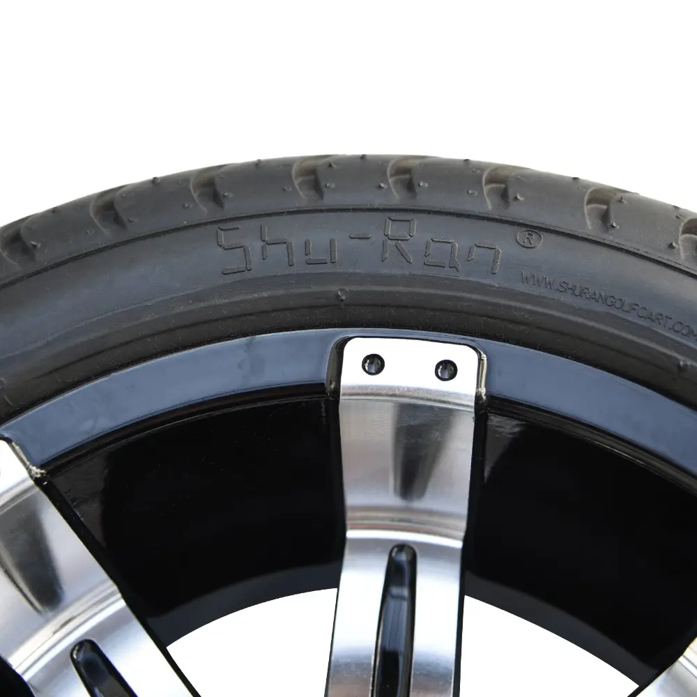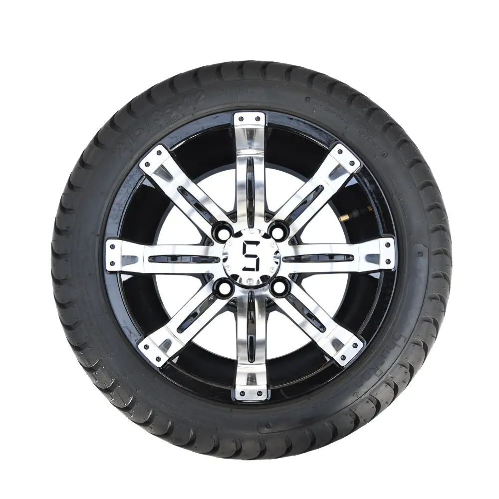 Upgrade your golf cart with this 215/35-12″ Machined/Gloss Black Tyre and Wheel Combo, offering style and performance in one package.