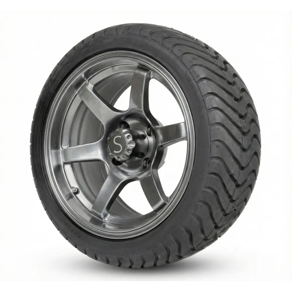 Enhance your golf cart’s style and performance with this eye-catching 14″ gloss black and dark silver wheel paired with a 225/30-14 low-profile tyre.